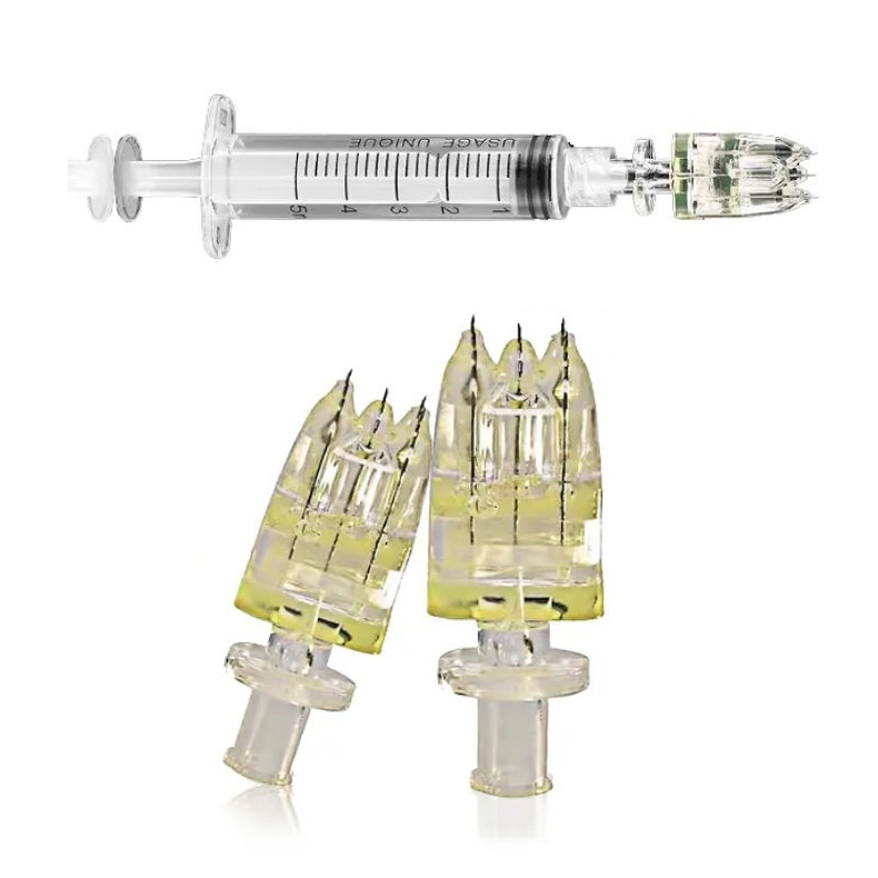 There are usually 4 pins ,5 pins or 9 pins needles, and the thickness of the needle is generally between 32G and 34G (the larger the value, the thinner the needle). The design of the 9 needles is more dense compared to the 5 needles, and the injection is more uniform and easier to absorb. This also improves the injection efficiency. In addition, G represents the thickness of the needle. The larger the value in front of G, the smaller the pain caused by the needle, which represents the thinner the needle.